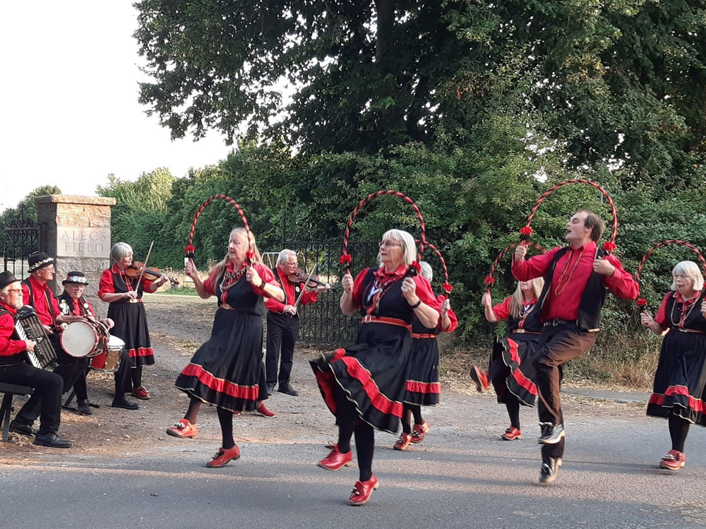 The loud and lively big band play traditional English folk music for the dancing on a range of musical instruments including an accordion, melodeon, fiddles and drums.