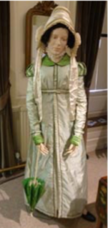 This stunning gown has sleeves to the elbow (apparently a German influence) which was acceptable particularly for the ‘dinner hour’ when arms were revealed to a ‘graceful height above the elbow’. Importantly for “Lucy” there are slits each side to allow the wearer access to her waist tied ‘pockets’, which were small and often, embroidered with drawstring bags.