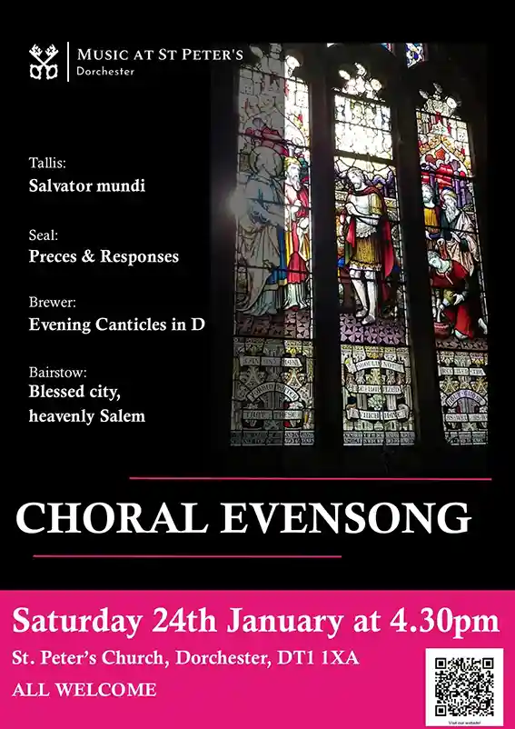 You are warmly invited to our monthly, cathedral-style service of Choral Evensong on Saturday 24th January at 4.30pm in St Peter’s Church, Dorchester. The music includes Tallis’s ‘Salvator mundi’, the ‘Preces & Responses’ by Richard Seal, Brewer’s ‘Evening Canticles in D’ and ‘Blessed city, heavenly Salem’ by Bairstow. Admission is free and there is a […]