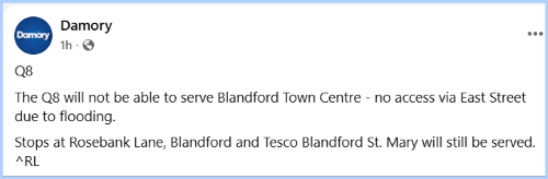 Damory has confirmed that its Q8 service is currently unable to serve Blandford town centre, as access via East Street is blocked due to flooding.