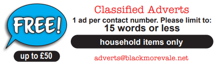 Are you looking for Blackmore Vale advertising? Our FREE ADS cover items by private sellers up to the value of £50. For other items and ads advertise here. Once accepted, free ads will appear in the next issue.