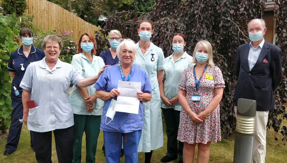 The trustees gave the prize to health care assistant Carol Wilson. Carol has worked for the NHS for 45 years, 40 of those at the Yeatman. She was presented with the prize by chairman of the Friends David Hayes at a ceremony at the Hospital (pictured below). Asked about her long service, Carol said how much she had enjoyed working at the Hospital and had seen many changes over the years… “It’s like being part of a family devoted to the care of our patients”.