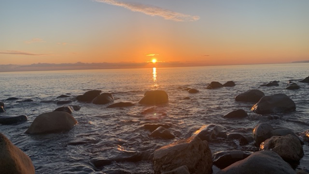 Eventually, I find myself wrapped up warm and strolling beside the incoming tide. Tiny rhythmic waves grace the shore from an ocean as flat and still as glass. Cirrostratus and stratocumulus clouds lace the horizon. It is a perfect winter seascape.