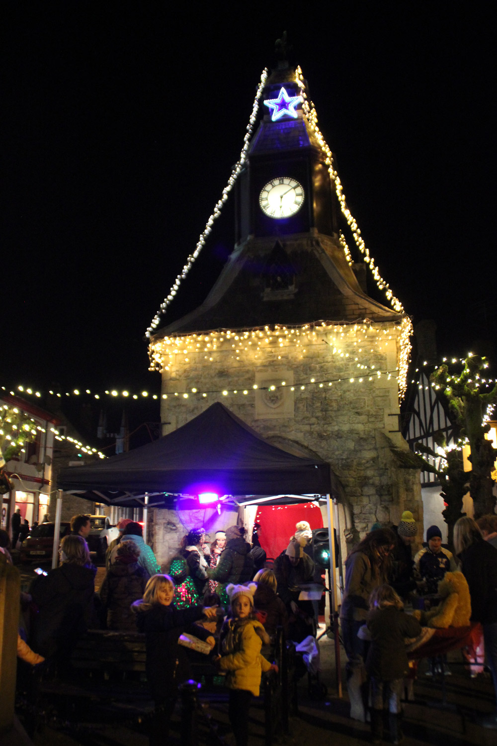Friday 3 December saw the switch-on of Mere’s Christmas Illuminations. Father Christmas was in attendance, and the queue for free presents was very, very long. The weather was as crisp as it should be for the time of year, with snow falling on the town clock island!