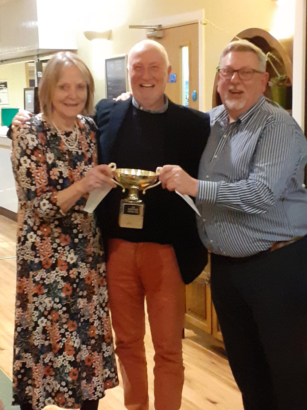 Vice-captain Russell Mead (centre) is pictured presenting the Winter Sheppard Trophy to Jennie and Paul.