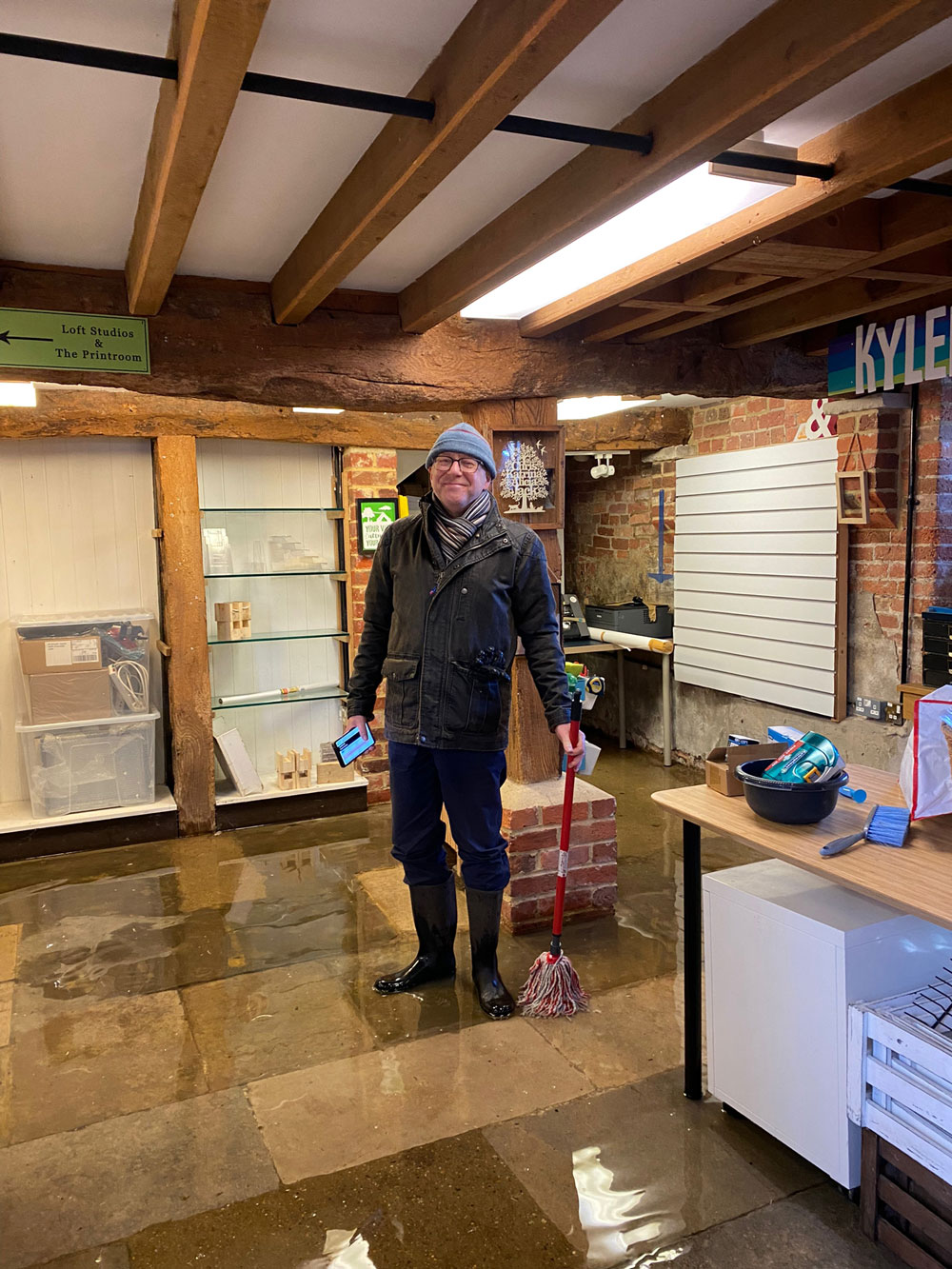 Walford Mill trustees dashed with mops to Wimborne’s grade II listed mill building as heavy rainfall saw water seeping through the ancient flagstones.