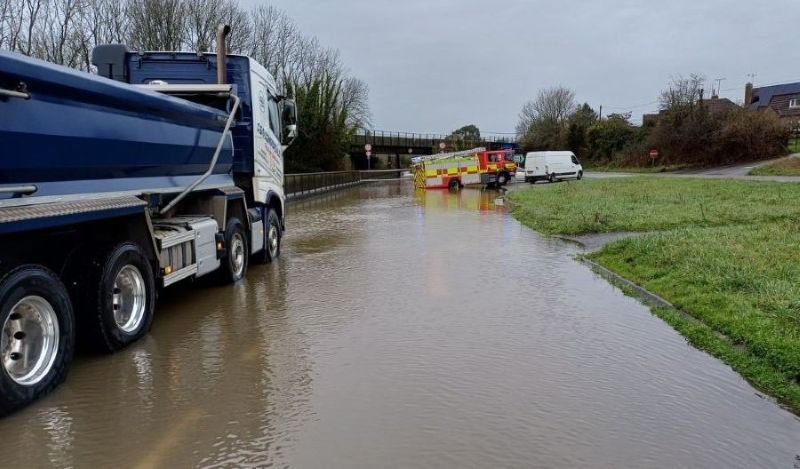 Dorchester Fire Station reported the A37 is closed near Stratton (pictured above), causing long delays, with flooding also affecting the road to Bradford Peverell.