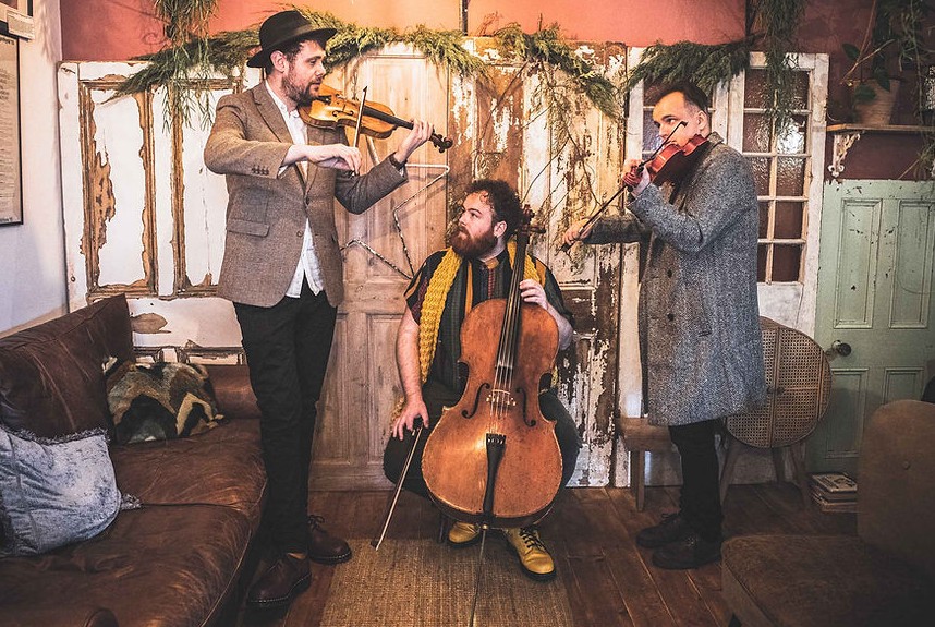 Consisting of Jordan Price Williams (cello, voice), Aneirin Jones (violin, voice) and Patrick Rimes (viola, violin, voice), the trio harnesses the raw energy of the fiddle with the finesse of the violin, and the beauty of chamber music with the joy and hedonism of a pub session, all underpinned by powerful vocal harmonies