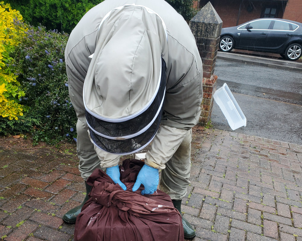 Back in Blandford, we found the swarm in a big osmanthus shrub, about two metres above ground level and fairly easy to reach. The plan is always to offer the bees a ready solution to their home search – a woven skep or just a nice big cardboard box. Something that’s dry and dark inside will work. In this case, we used a cardboard box. The house owners told us the shrub was due to have a haircut, so we were able to remove a few of the branches, collecting them in the box. We shook the bees off the branches and turned the box upside down, placed it on a sheet, and put a wooden wedge at one side. Then you stand back and watch. There are always a few bees that continue to fly around the original site of the swarm, but if the queen has taken up residence inside the box, her workers will start fanning their wings, putting a chemical pheromone into the air, telling the remaining bees outside that “we’re all going in here”. Thirty minutes later, almost all the bees in the swarm had gone into the cardboard box. The heavens also opened, and the heavy rain probably helped them make their minds up! Job done… Well, almost. We used the sheet to wrap around the box full of bees, making it safe to transport to their permanent home. There was a perfectly prepared hive waiting for them with another beekeeper in Iwerne Minster, where they’ll be looked after as they build back to a full-strength colony during the rest of the summer.